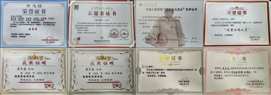 20232024年国家励志奖学金;20222023年国家励志奖学金;“铁人式大学生”称号; 挑战杯校级优秀奖;2024年暑期社会实践优秀个人;院学生会“优秀工作人员”。