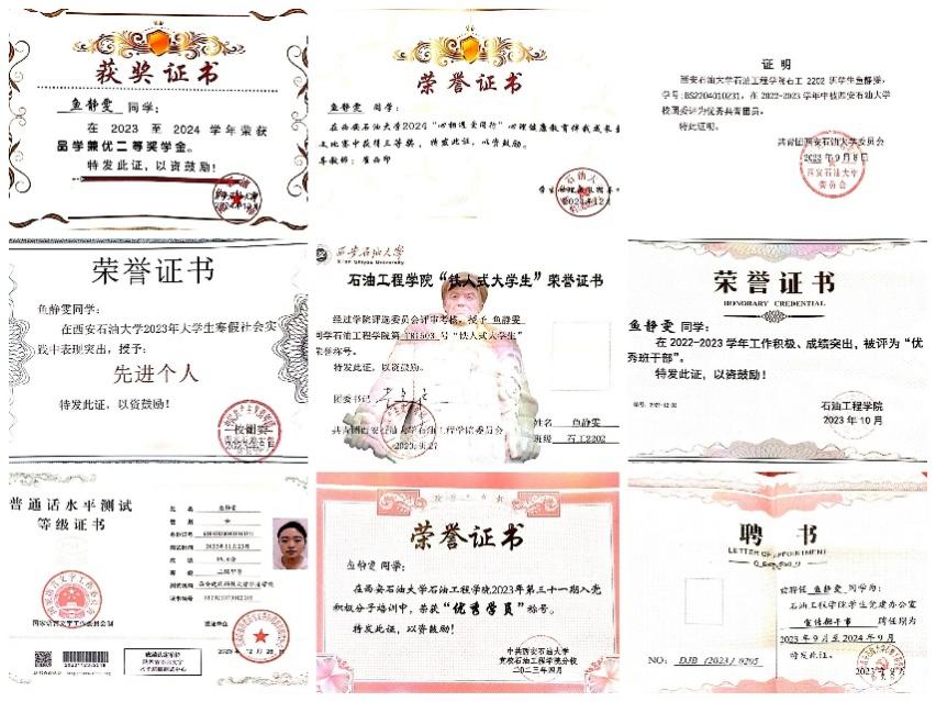 鱼静雯,女,汉族,出生于20043月,陕西咸阳人,中共党员,十大足彩平台 2022级石油工程专业2202班学生。现任班级团支书,曾任十大足彩平台 融媒体中心副主任。现已成功保研至西安石油大学攻读硕士研究生。